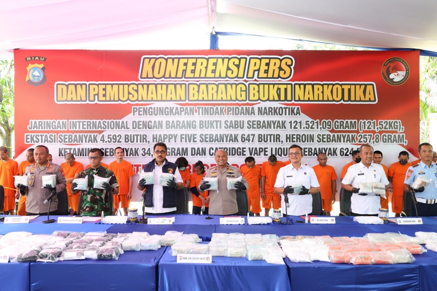 "Dalam tempo tiga bulan terakhir kami Polda Riau mengungkap kasus jaringan internasional di mana perannya bermacam-macam, yaitu ada sebagai kurir, pengendali, dan pengedar yang langsung menerima dan mengambil barang dari kurir laut melalui pelabuhan tikus yaitu Bengkalis, Dumai, dan Kepulauan Riau," jelas Direktur Reserse Narkoba Polda Riau Kombes Putu Yudha Prawira.